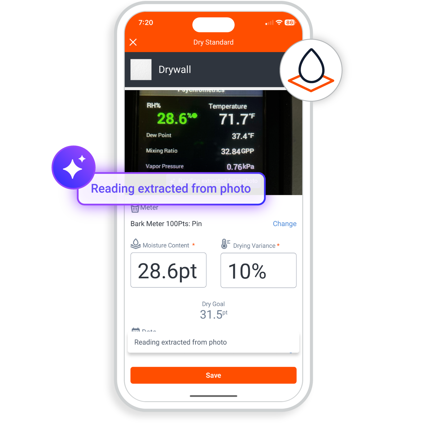 Ditch the manual entry. Entering hundreds of moisture readings on every visit is tedious and prone to error. Now you can simply take a photo of your meter and our OCR technology instantly extracts the Temperature and Relative Humidity readings, adding them to your drying log automatically. You save time on every monitoring visit and eliminate user input errors for good.