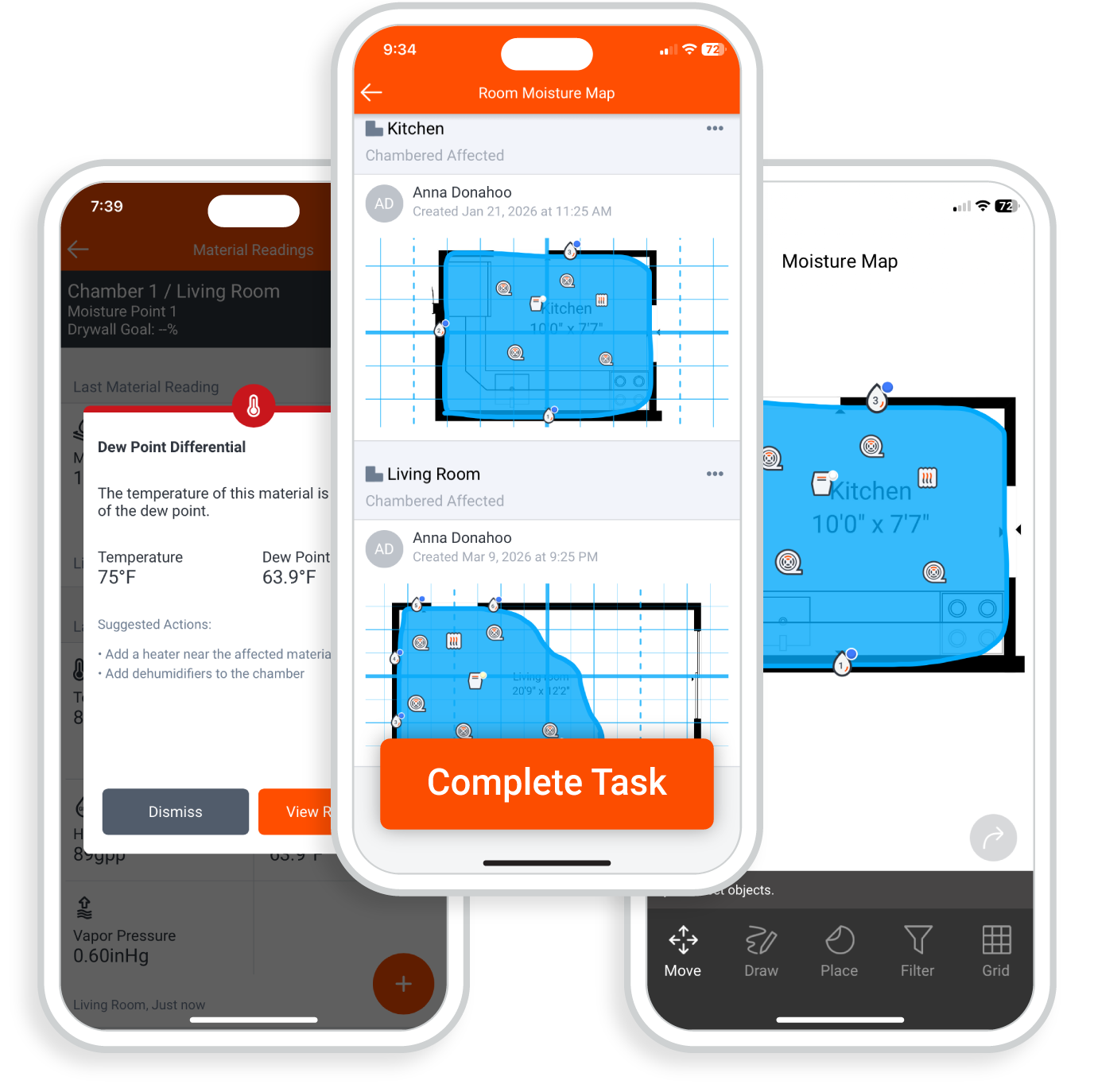Visualize your drying data. Turn complex data into clear visuals. Easily create moisture maps, add moisture points, and drying equipment. The app automatically calculates dew points and vapor pressure too, alerting your team if drying conditions aren’t being met so you can course-correct immediately.